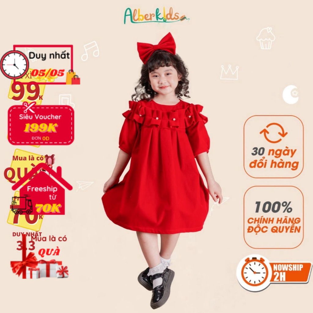 Váy bé gái ALBERKIDS nhung đỏ đính NGỌC dài tay công chúa xinh đẹp cho trẻ em gái từ 2,3,4,5,6,7,8,9,10,11,12 tuổi [V44] free ship